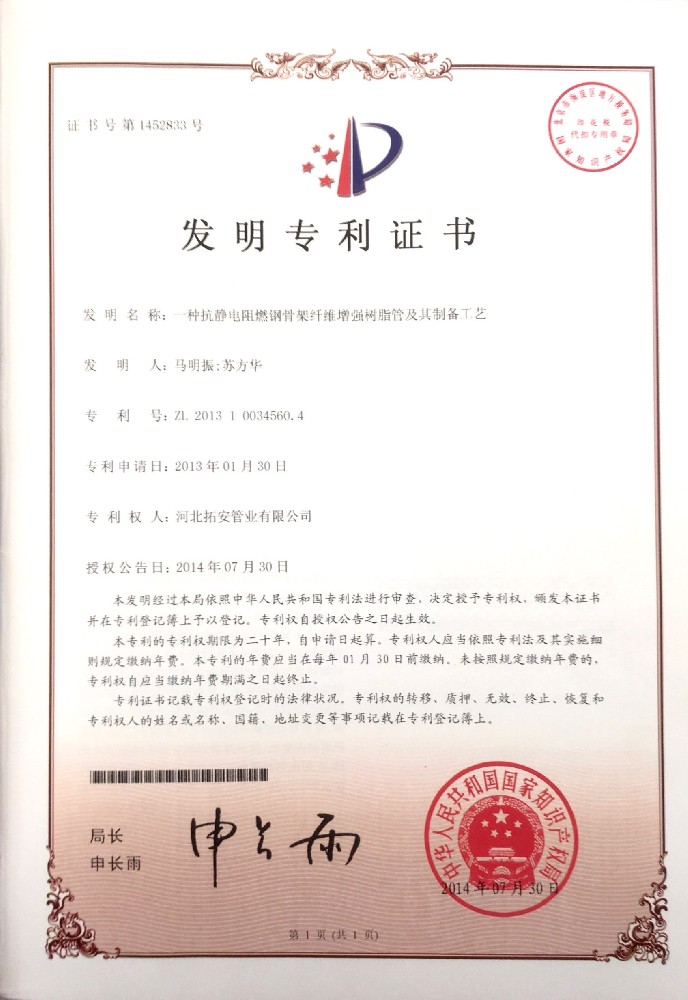 一種抗靜電阻燃鋼骨架纖維增強樹脂管及其制備工藝證書